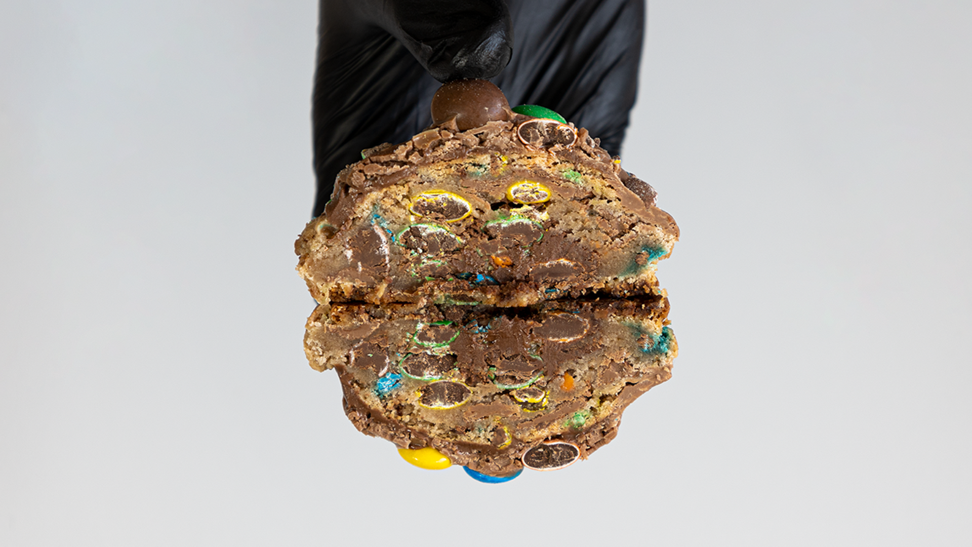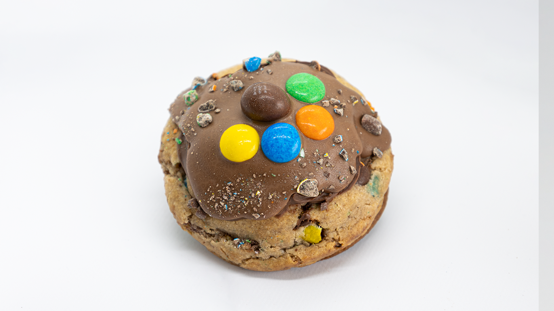 Een melk chocolate chip en m&m's* crunch Cookie. Getopt met m&m's, melk chocolade en m&m's/crunch.