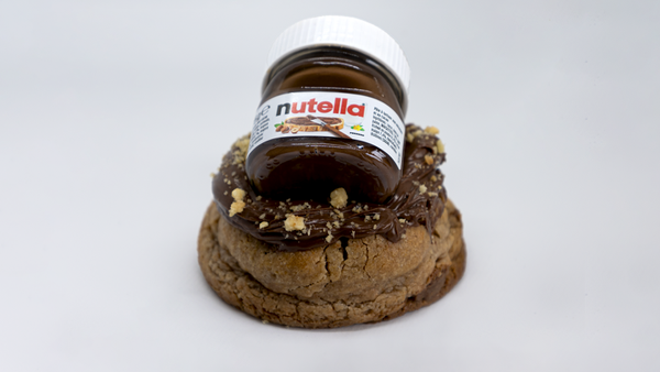 Een melk chocolate chip en hazelnoten Cookie met een vulling van nutella pasta. Getopt met melk chocoade, mini nutella koekje* en hazelnoten.
